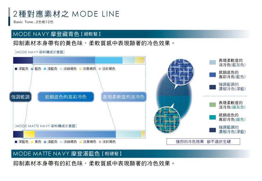 強烈的冷色容易過度乾硬。 要創造出明顯卓越的色味表現與日系獨特柔軟質地兩相平衡, 我們運用了羊毛織布料的原理─毛呢處方。 將濃淡、 彩度相異的冷色交互堆疊, 讓多重色料各司其職、 相互襯托, 表現出具有深度且顯著的冷色效果。